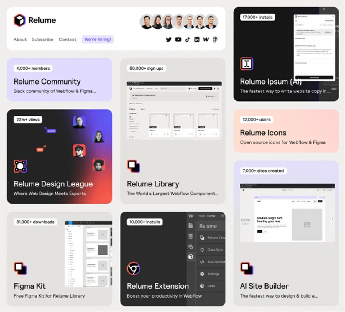 Relume結合AI功能成立的Relume Ipsum平台,以GPT-3 AI語言模型結合Relume獨有的演算法技術生成網站內容,節省設計師完成網站的時間,讓他們可以將剩餘的30%的時間,更專注於如何「設計」讓網頁更吸引人。 Relume Ipsum平台使用方式和ChatGPT類似,會讓AI根據設計者欲建立的網站內容描述,將文字內容快速生成為視覺化的網站架構圖(sitemap),包括頁面內容、標題以及排版好的區段設計,幫助設計者規劃好吸引目標客戶的內容頁面,以及符合企業形象的網站定位。 若使用者想進一步設計架構圖,能夠將生成的架構圖或是頁面複製到Figma或Webflow做調整,三個平台的架構、元素皆可互相通用。Relume同時也提供Relume Library平台,平台中的素材庫可讓設計者能夠有更多的參考,設計出更符合預期的網站風格。 webflow介面編輯 Relume可以將內容複製到 Figma或Webflow網頁中,用戶同樣可以進行設計、編輯等內部工作。 Relume YouTube Nike等知名企業使用,Relume目標成為下一個Canva Relume目前提供7天的免費試用期以及1次的免費版方案,但免費版只提供用戶建立1次網站。